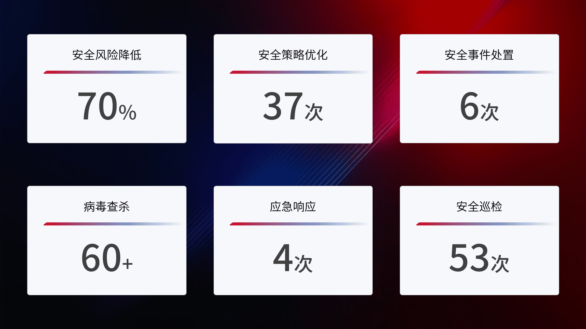 提供全面的安全事件报告体系,,,,包括处置报告、、、、周报、、季度和年度总结,,,,结合持续监控,,,,帮助客户深入了解网络安全状况。。